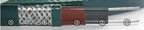 1、鍍錫軟銅芯線為導(dǎo)體;2、導(dǎo)電塑料層;3、絕緣層;4、鍍錫銅絲編織屏蔽;5、氟塑料絕緣防腐外套